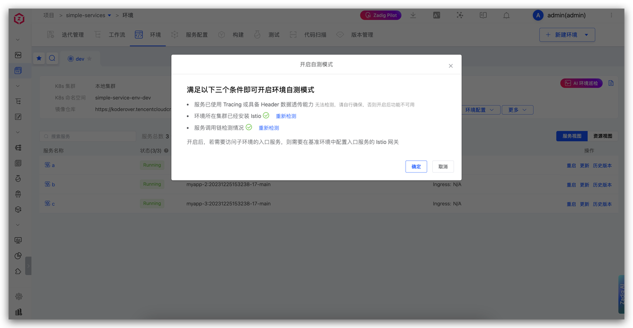 在 Zadig 环境管理中,为基准环境(如 dev)开启“自测模式”功能。系统将自动检查相关依赖(如 Istio),并完成入口网关等基础配置。