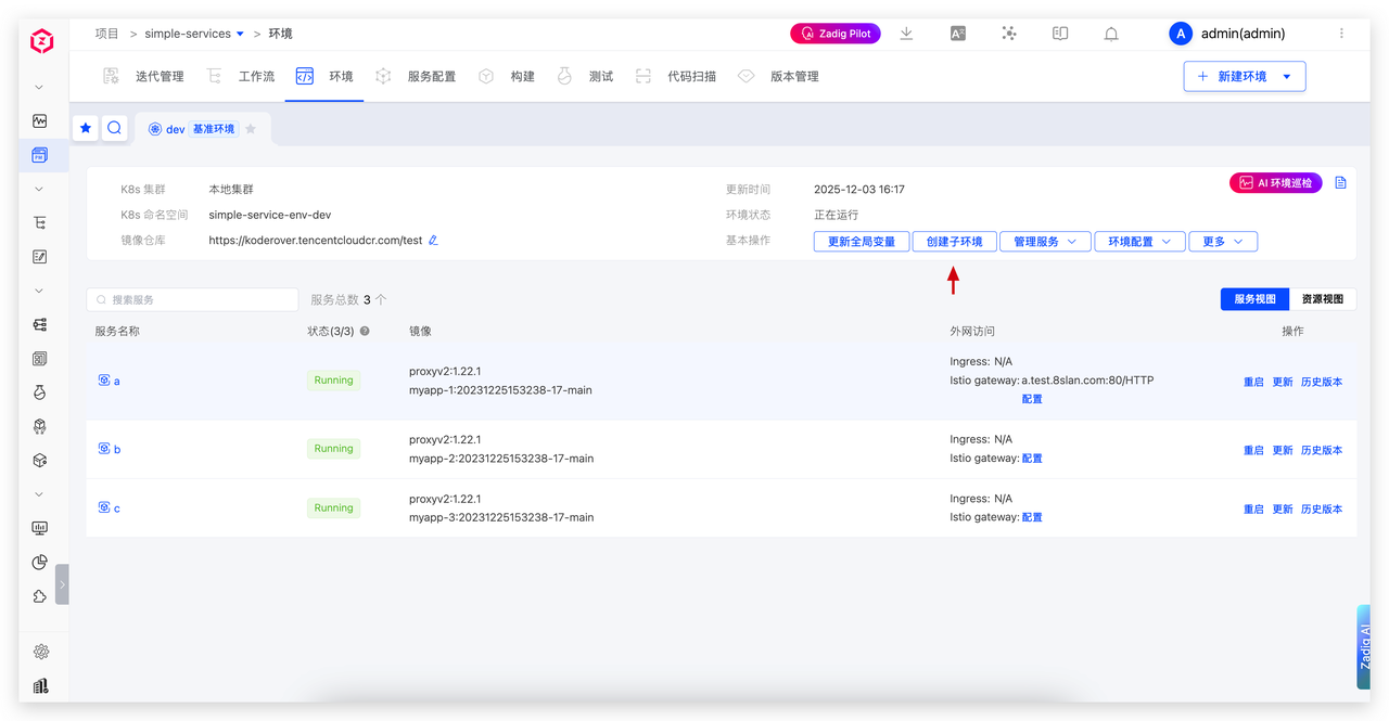 在已开启自测模式的基准环境中,点击“创建子环境”。选择本次需要变更和调试的服务(例如服务 a),系统会自动生成一个独立的子环境(如 dev-feature-x)。
