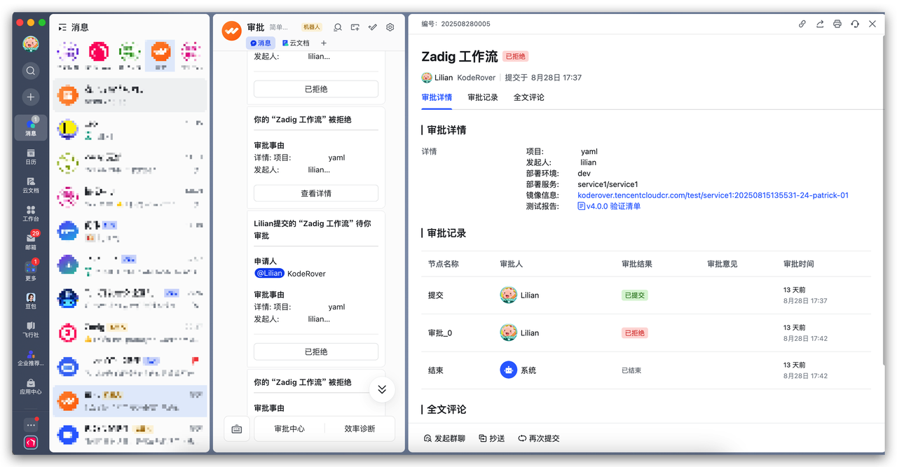 - 运维生产发布 在生产发布环节,Zadig 提供了包含配置变更、数据库变更和业务发布在内的完整工作流编排。当流程进展到需要审批时,系统会通过飞书向负责人发起审批请求。审批人点击卡片即可跳转查看详细的发布内容(如版本差异、变更日志),直接在飞书内完成审批,既保证了安全,又减少了沟通成本。