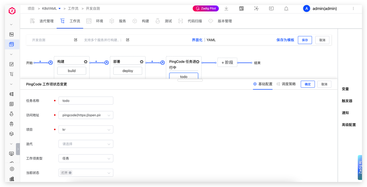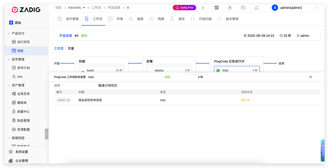 开发者向 Git 提交代码,触发 Zadig 开发环境部署工作流。代码部署成功的同时,Zadig 自动将该分支关联的 PingCode 需求状态更新为「进行中」,项目经理实时可见。
