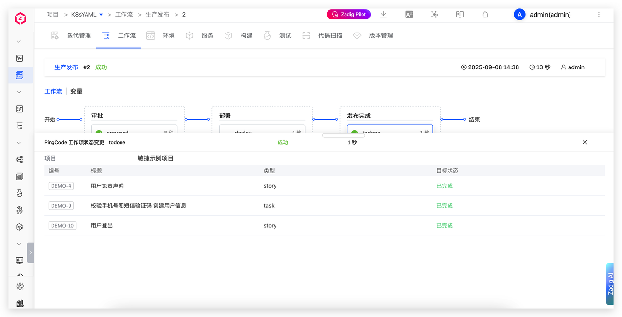 审批通过后,执行生产发布工作流。发布成功的那一刻,所有本批次的需求状态自动变为「已完成」,真正实现发布即完结。