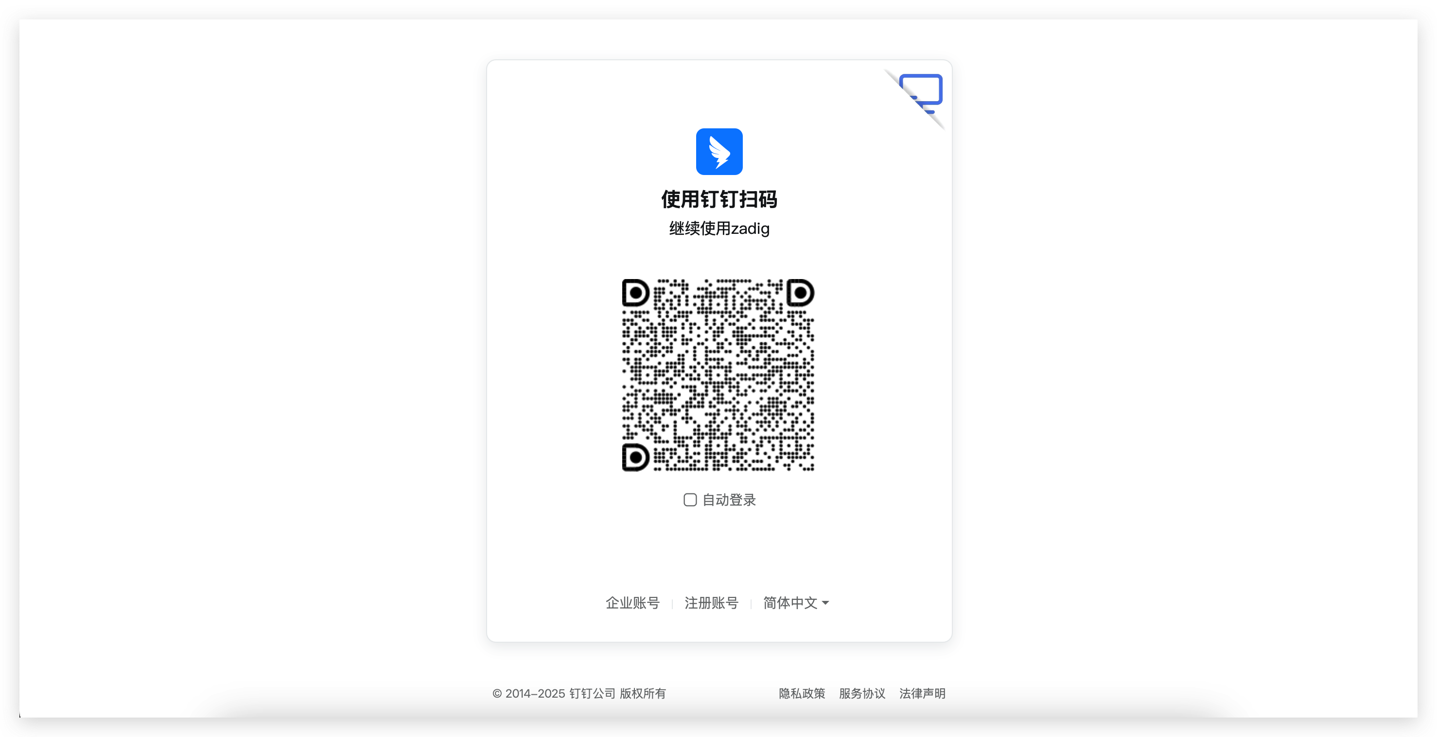 配置完成后,访问 Zadig,完成钉钉账号认证后即可快速登录 Zadig。