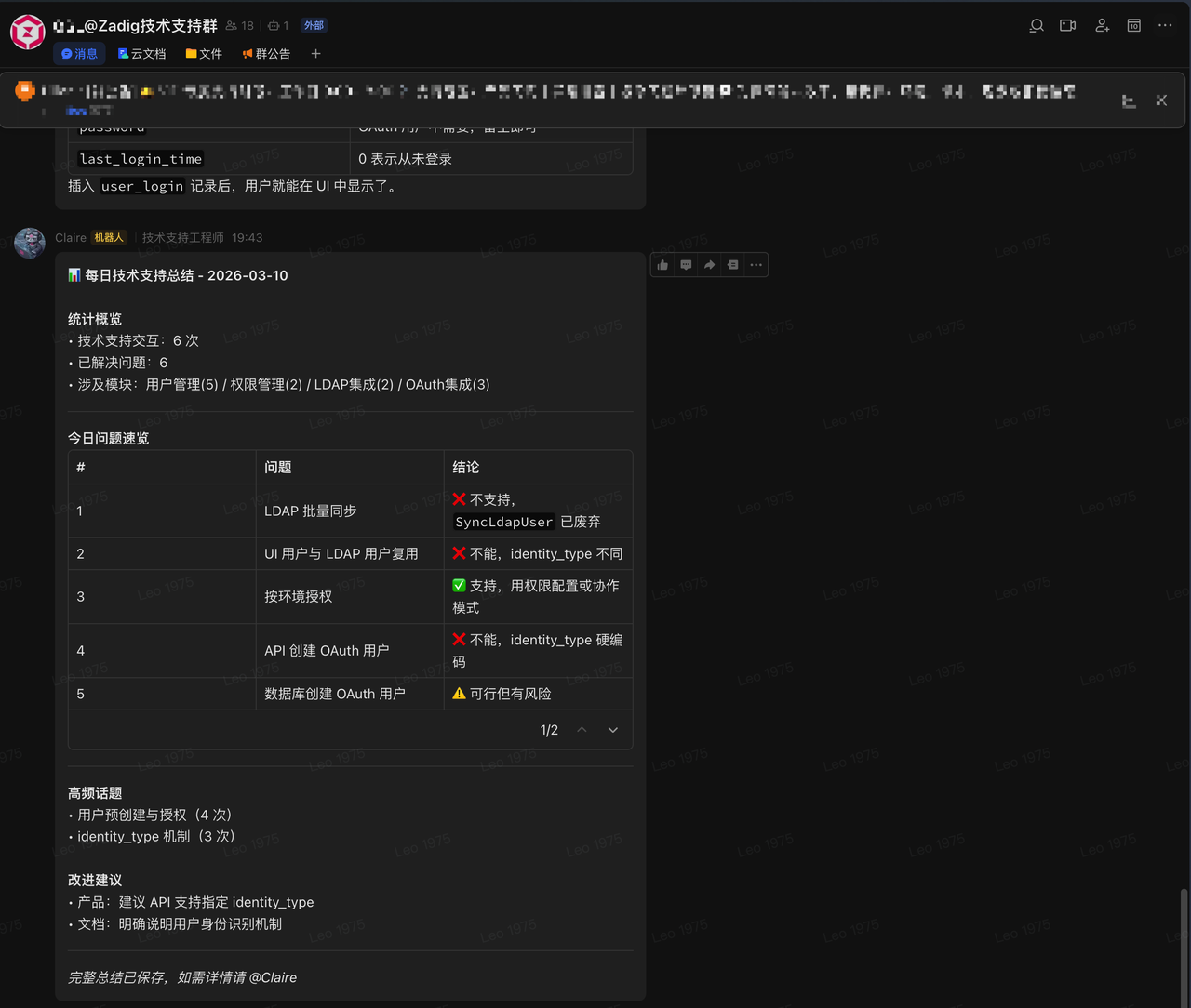 每天 18:00,Claire 自动巡检当天所有群的技术支持记录,生成每日总结: