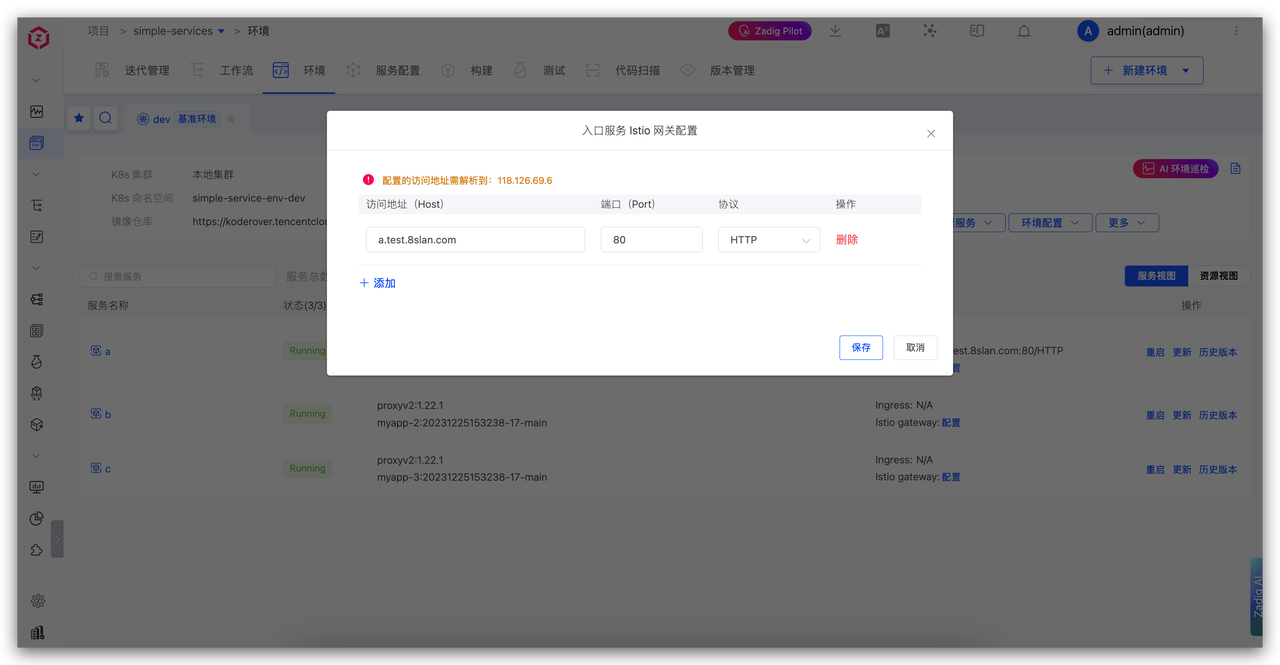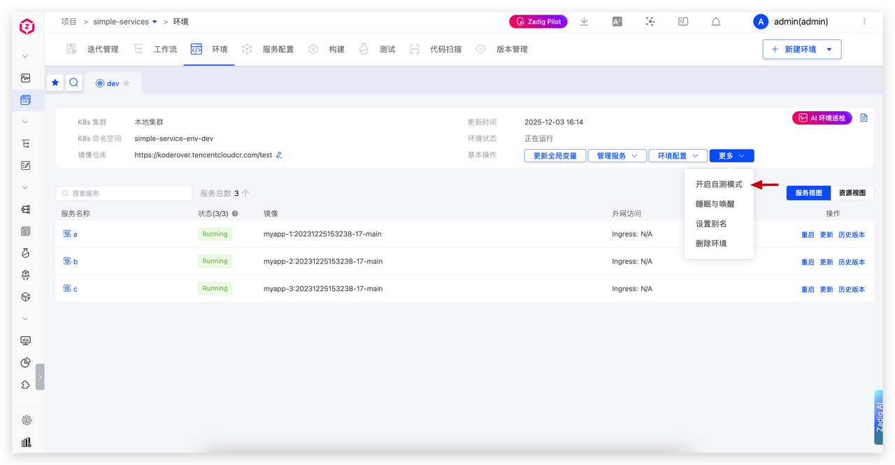 在 Zadig 环境管理中,为基准环境(如 dev)开启“自测模式”功能。系统将自动检查相关依赖(如 Istio),并完成入口网关等基础配置。