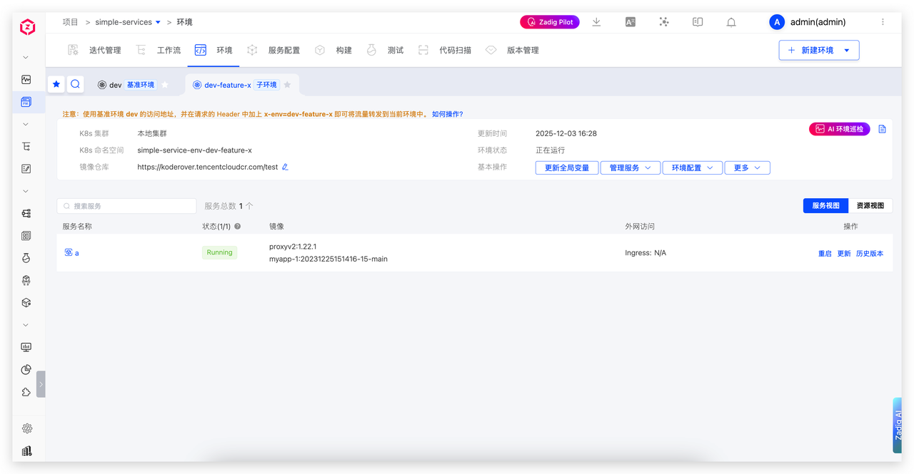 在已开启自测模式的基准环境中,点击“创建子环境”。选择本次需要变更和调试的服务(例如服务 a),系统会自动生成一个独立的子环境(如 dev-feature-x)。