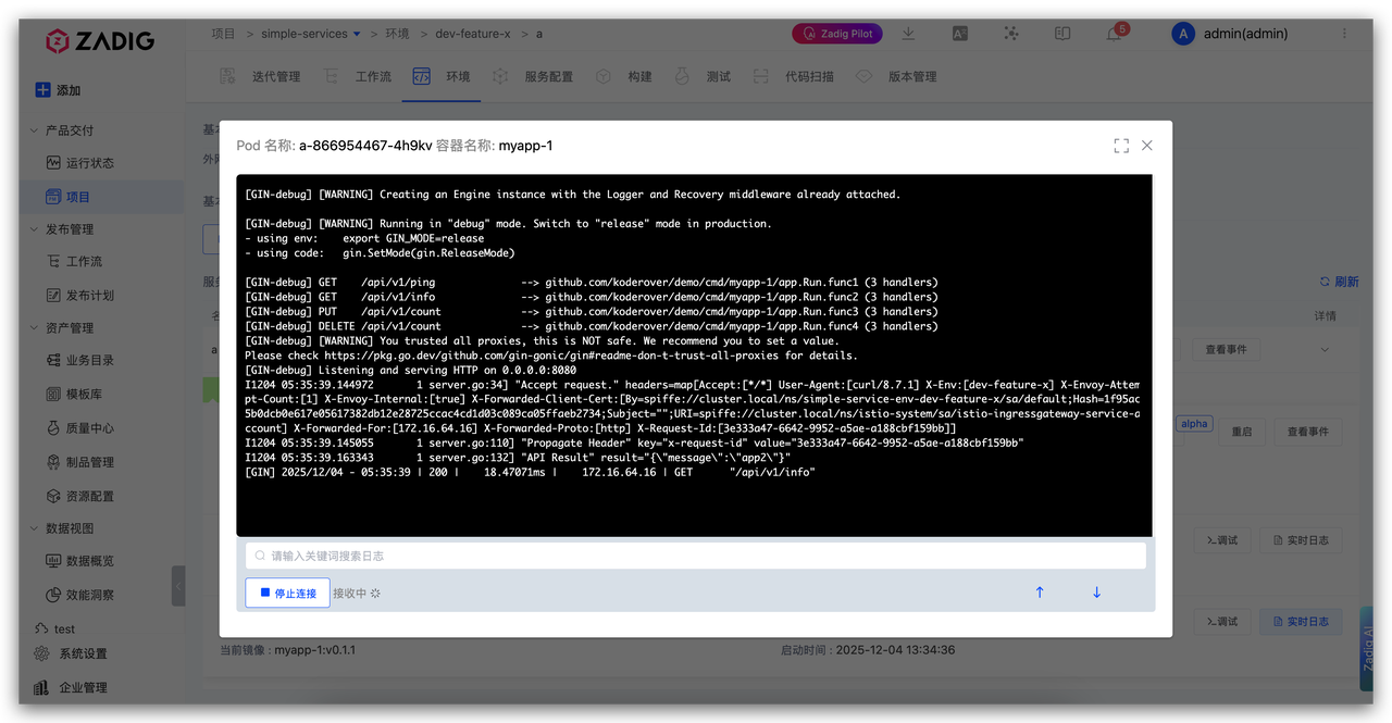 查看子环境 a`服务日志,确认请求已按预期路由至变更服务,完成闭环验证。