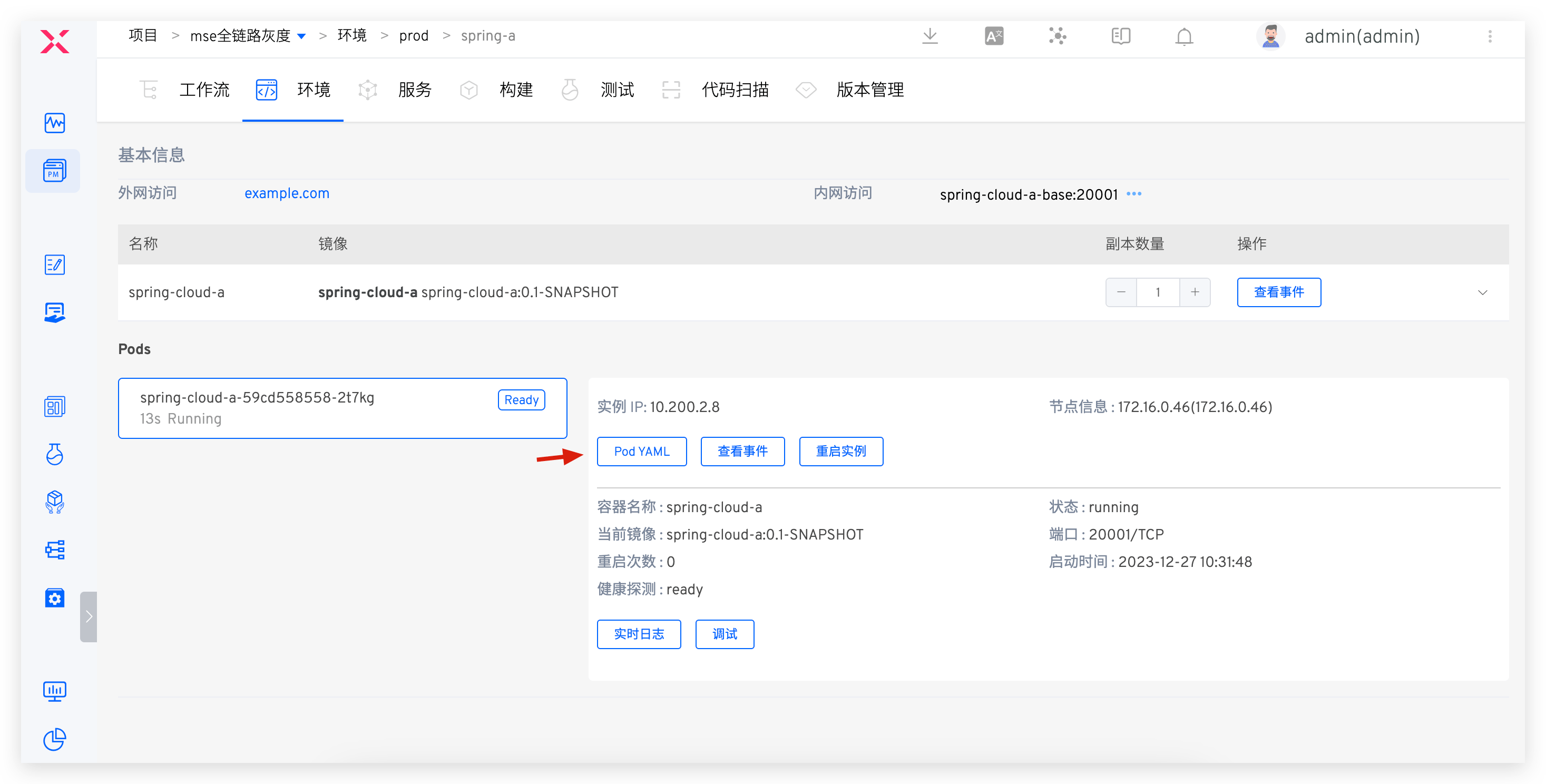 部署完成后,可在生产环境中查看灰度服务的运行状态和基本信息。
