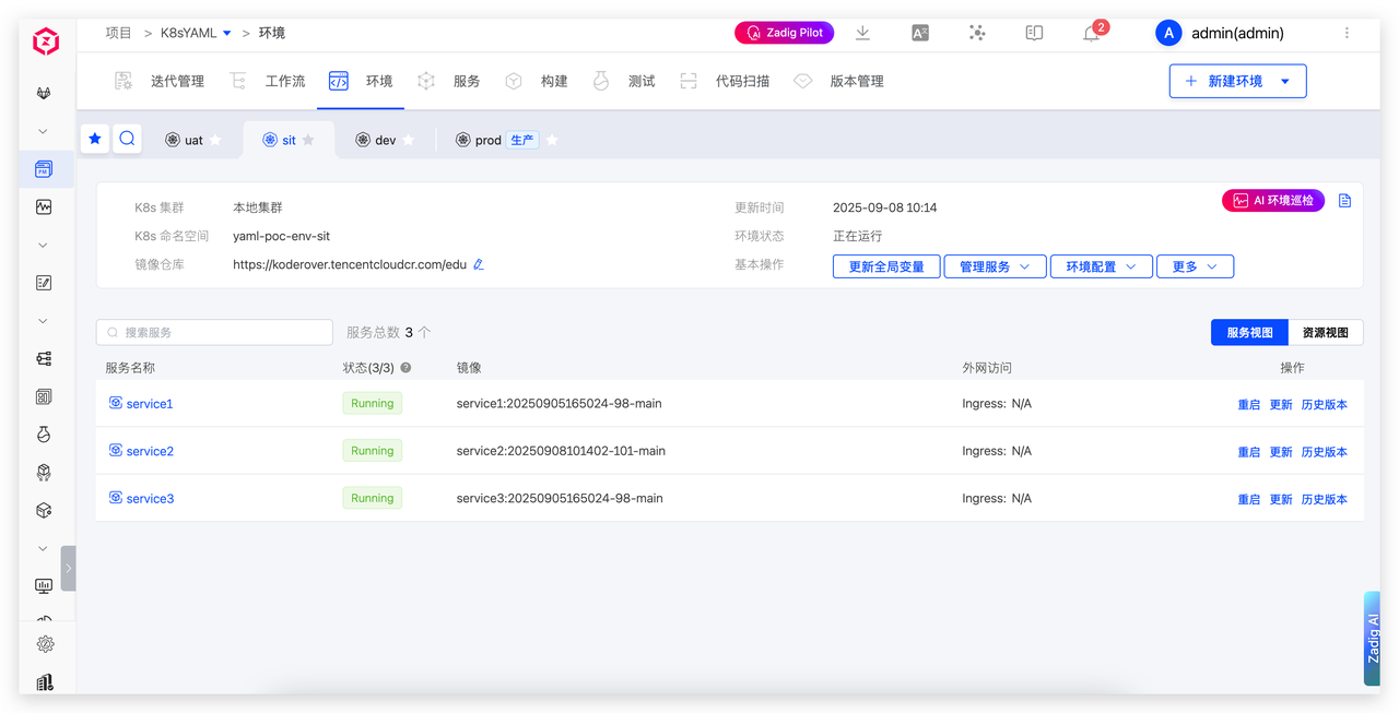 根据你的研发流程(如:开发、测试、生产)在 Zadig 中配置好对应的环境。