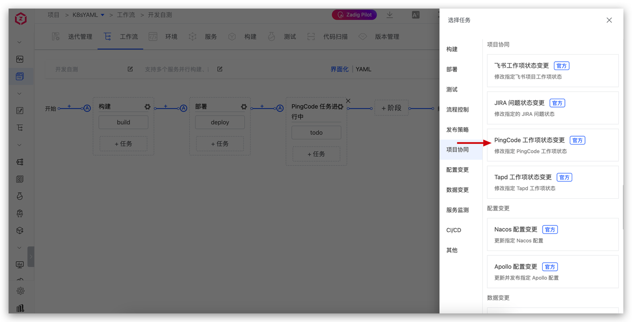 开发者向 Git 提交代码,触发 Zadig 开发环境部署工作流。代码部署成功的同时,Zadig 自动将该分支关联的 PingCode 需求状态更新为「进行中」,项目经理实时可见。