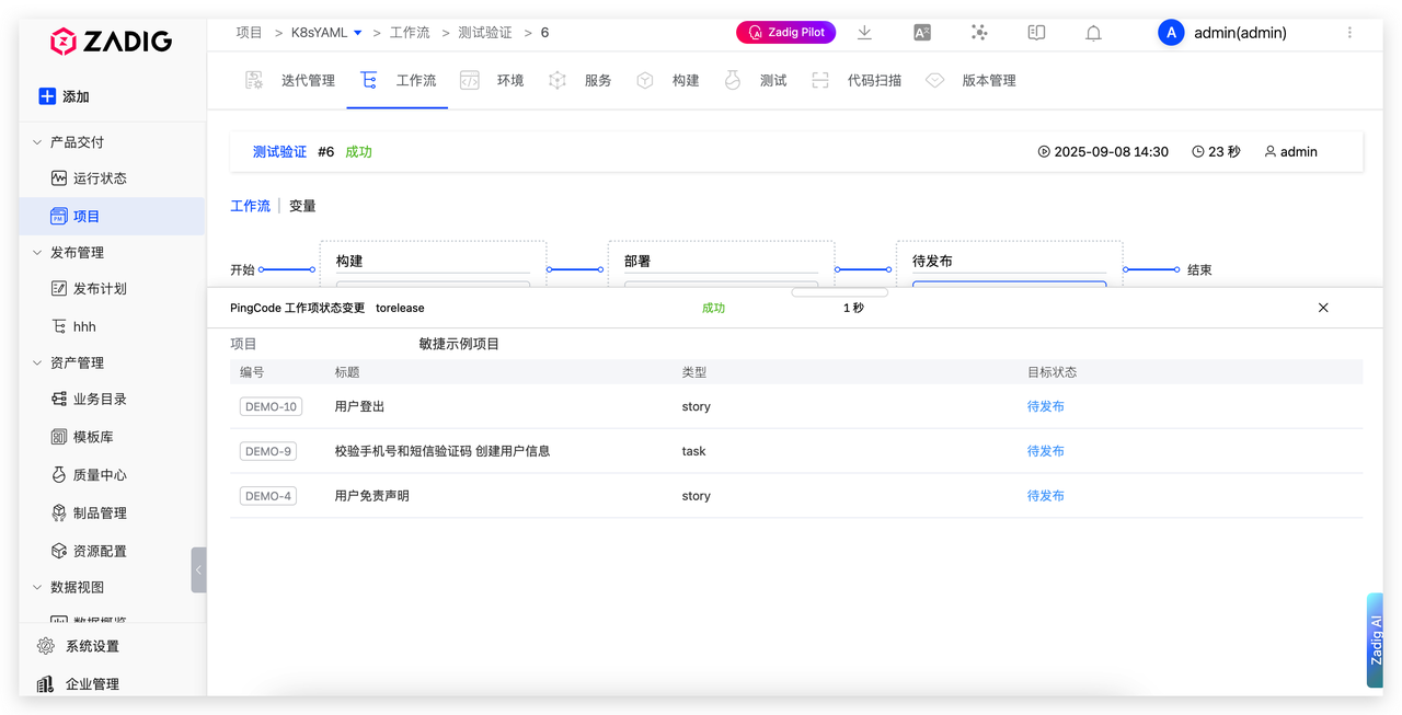 测试人员在 Zadig 一键触发测试工作流,运行自动化测试套件。测试通过后,工作流自动将关联的多个需求状态批量更新为「待发布」。
